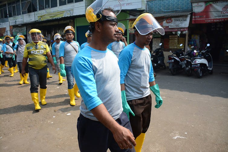 Pekerja sehabis membersihkan dan mendisifektan pasar Kranji. ECTADINDONESIA/flickr, CC BY